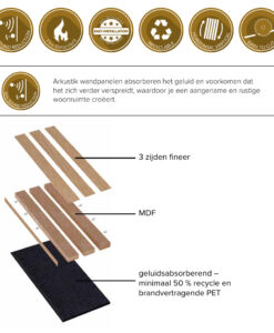 Deze akoestische oplossing versterkt de uitstraling van je interieur. De mdf-lamellen zijn afgewerkt met hoogwaardig fineer, voorzien van kleine scheurtjes en nokken voor een natuurlijke uitstraling. De PET-panelen zijn vervaardigd uit geperste, geluidsabsorberende polyesterwol.