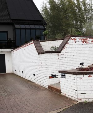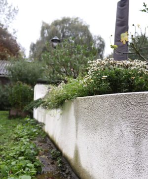 Witte synthetische acrylaat coating voor binnen en buiten, blokkeert het binnendringen van vocht en beschermt tegen vochtinsijpeling, op pleisterwerk, steen, beton, cementering, op vochtige keldermuren, grondmuren, tuinmuren, betonpaaltjes.
