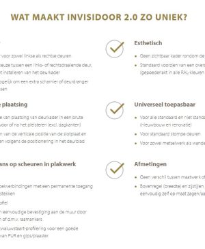 Maximale flexibiliteit in onzichtbare deurkaders, dat is waar invisidoor 2.0 voor staat. Het deurkader van de Invisidoor 2.0 bestaat uit een basisprofiel met een u-profilering, waarbij aan de hand van diverse adapters de positie van de invisible neo scharnieren en het slot vrij gekozen kan worden. Het basisprofiel voor zowel links als rechts draaiende deuren is hetzelfde waardoor de draairichting van de deur ook na het inpleisteren nog steeds vrij gekozen kan worden.