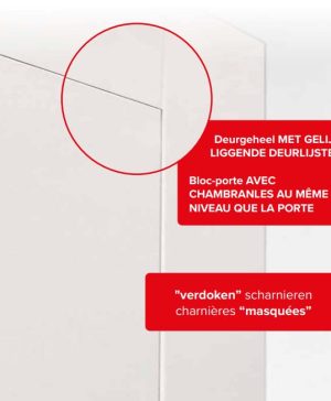 De Thys deur “Concept Invisible Flat” is een wit voorgelakte schilderdeur met tubespaan kern, klaar om te installeren. Het is een deurgeheel met gelijkliggende deurlijsten. Ook bijzonder aan deze deur zijn de onzichtbare/verzonken scharnieren en het magnetisch slot.