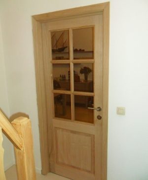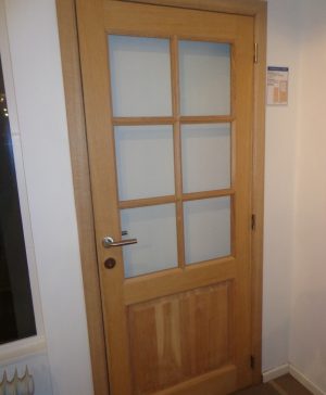 Forte eiken deur met helder glas (reeds geplaatst). Deze deur werd geselecteerd om haar eenvoud van installatie, eenvoud van onderhoud & milieuvriendelijkheid. De deurstijlen en de tussenregels zijn opgebouwd in massief houten lamellen, overgefineerd in eik. De panelen, mouluren en kantlat (6mm) zijn gemaakt van massief eik.
