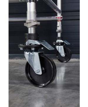 De (Ø 150 mm) wielen van de kamersteiger hebben een rubberen loopvlak. Dat maakt ze geschikt voor binnenshuis.