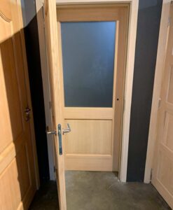 Moulura eiken stijldeur met mat veiligheidsglas. Deze deur werd geselecteerd om haar eenvoud van installatie, eenvoud van onderhoud & milieuvriendelijkheid. Deze deur is opgebouwd uit een kader in massief eiken, verstevigd ter hoogte van het slot met een voorgevormde, in eik gefineerde MDF dekplaat. Mat glas is inbegrepen en reeds geplaatst in het deurblad.