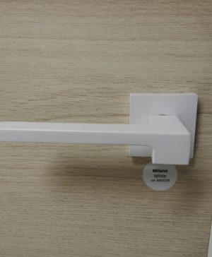 Witte deurklink op vierkante rosas. Wordt verkocht per paar.