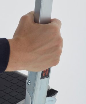 De steunbeugel biedt ruimte voor je gereedschap. En je hebt extra grip als je op de bovenste trede staat.