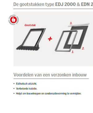 VELUX gootstuk voor verzonken & geïsoleerde inbouw. Keuze uit een gootstuk voor gegolfde dakmaterialen (type EDJ 2000) en gootstuk voor leien of vlakke dakmaterialen (type EDN 2000).