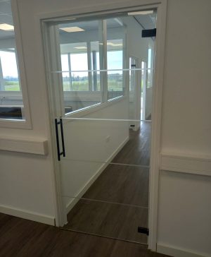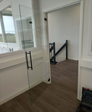 Doorslaande glasdeur in 8 mm helder veiligheidsglas met 4 matte, horizontale lijnen. Makkelijk in onderhoud.