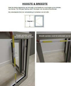 Het doorgeven van de juiste afmetingen is steeds uw eigen verantwoordelijkheid! Dit is een maatwerk artikel en maatwerk artikelen kunnen NIET geretourneerd worden. De bovenaan gevraagde afmetingen zijn erg belangrijk want wij bepalen hiermee de juiste productiemaat (netto afmetingen van het afgewerkte vliegenraam).