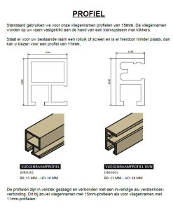 Standaard gebruiken we voor onze vliegenramen profielen van 15mm. De vliegenramen worden op uw raam vastgeklikt aan de hand van een klemsysteem met klikkers. Staat er voor uw bestaande raam een rolluik of screen en is er hierdoor minder plaats, dan kan u kiezen voor een profiel van 11mm.