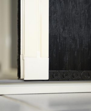Het zwarte geplisseerde gaas is voorzien van horizontale spandraden die extra stevigheid bieden aan het geheel. Doordat het onderaan in een kunststofketting zit gesloten, blijft het nauwkeurig ter plaatse tijdens het gebruik.