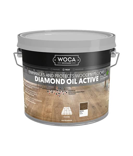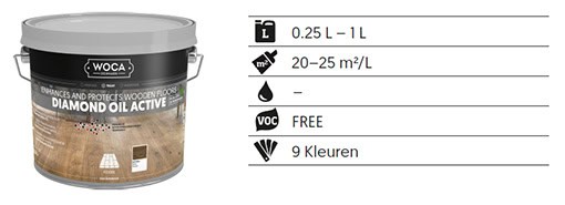 WOCA Diamond Oil Active is een 1-component, geurarme en extreem slijtvaste olie, gemaakt van grondstoffen van hoge kwaliteit. De olie is waterafstotend, eenvoudig te verwerken en zorgt voor veel minder productafval.